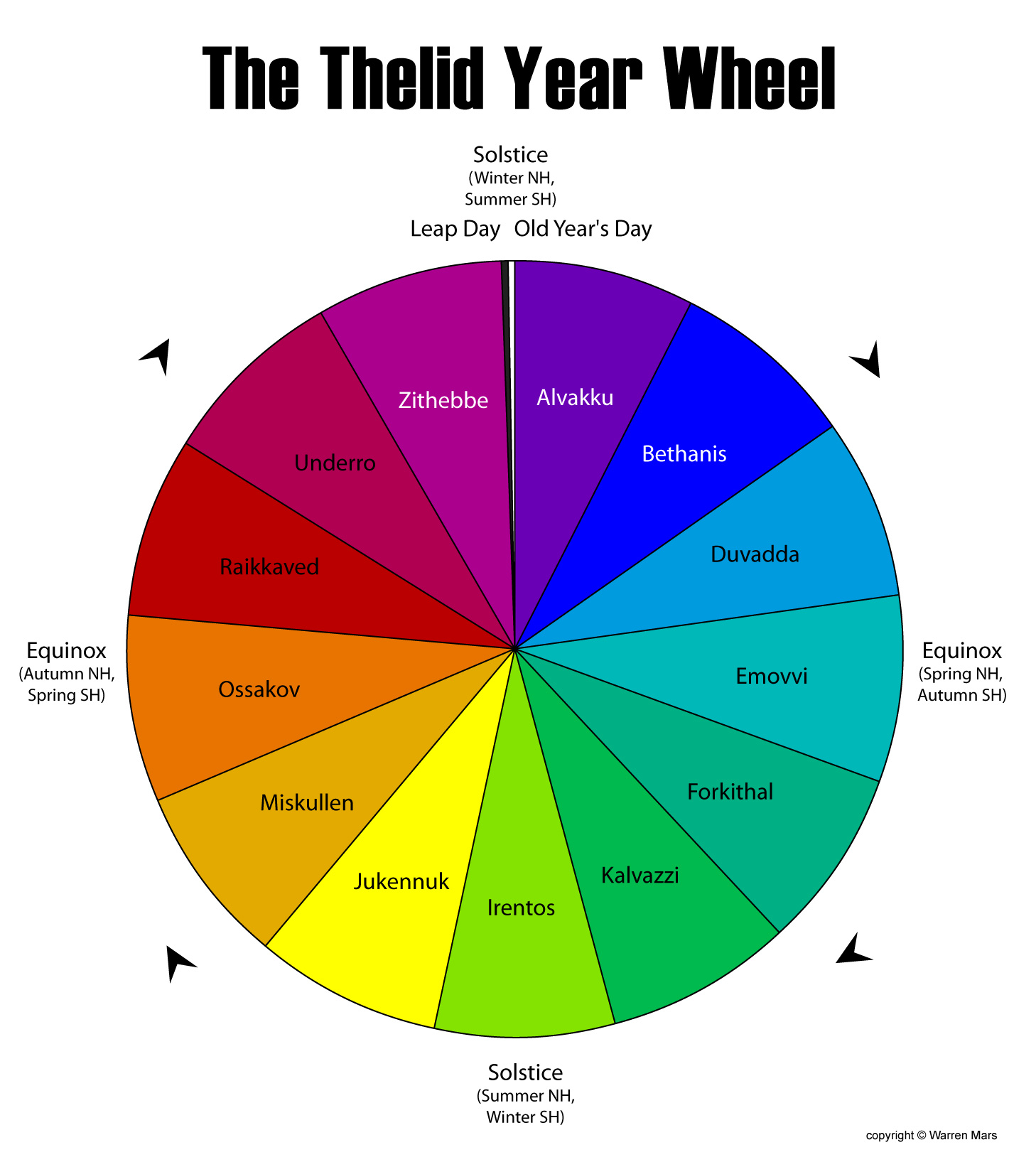 They say a picture is worth one thousand words, so for all of you who aren't too sure how the Thellid Calendar works, here is a graphical representation of the whole year. Start at the top and go around clockwise. You can clearly see how the year proceeds from the solstice on Old Year's Day (which has no month), to New Year's Day on Alvakku the 1st, through all 13 equal length months in turn, back to Old Year's Day again, with a Leap Day, (also without a month), thrown in 1 year in 4.